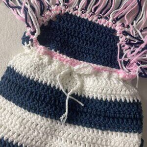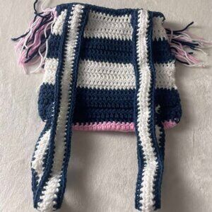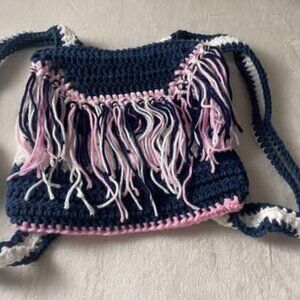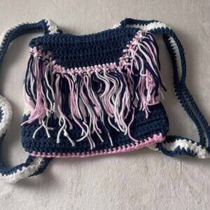 New Handmade Crochet Blue White & Pink Fringe Backpack