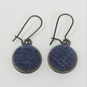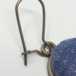 Dark denim blue button made with upcycled fabric. Hangs from a bronze tone ear wire.
