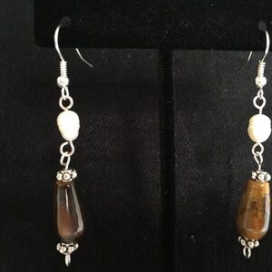 Gemstone earrings designed and hand made by an artist in Mexico. Tiger Eye with Fresh Water Pearl beads with silver daisy separators on bronze wire with silver connectors and silver earring hooks. About 2.25" long.