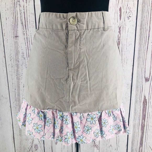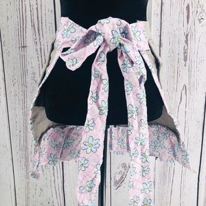 Handmade waist apron with adjustable tie. Pinstripe apron with hand sewn ruffles with pink floral prints, with complete functioning pockets. #cooking #kitchen #apron