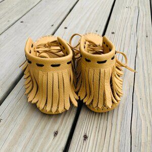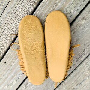 No size marked, see measurements in photos. Handcrafted, flexible leather soft sole, zero drop, fringe, sheepskin insole, possibly moosehide but I'm not certain. See last two photos that show pin holes which I think came from the stitching process. I purchased these preowned on another platform, but they are too small for me.