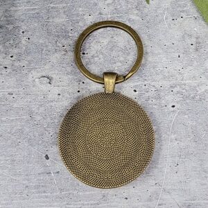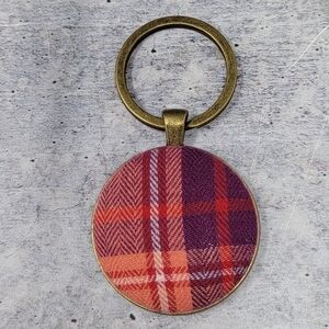 Beautiful upcycled peach & purple plaid fabric button charm on a bronze key ring.