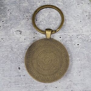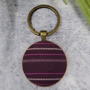 Beautiful upcycled dark purple striped fabric button charm on a bronze key ring.