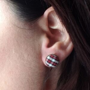 Green & white polka dot stud earrings made from an upcycled shirt. Handmade by Huffychic, so each item is unique.
