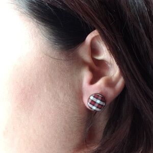 Pink & purple stripe stud earrings made from an upcycled shirt. Handmade by Huffychic, so each item is unique.