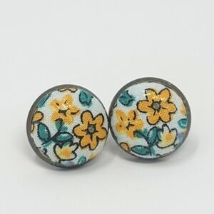 Yellow & green flower fabric button stud earrings made from upcycled clothing.