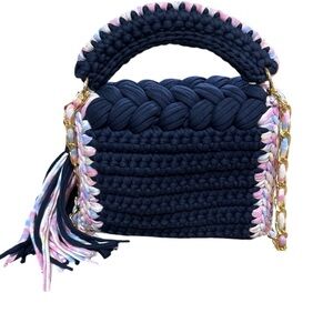 New Handwoven Chunky Knit Crochet Bag Navy Pastel Crossbody Purse with Tassel