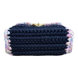 This handwoven chunky knit crossbody bag is a boutique-worthy showstopper. Crafted with navy blue yarn and finished with tie-dye pastel trim in pink, purple, ivory, and blue, this structured beauty features gold hardware, a triangle turnlock closure, and a removable tassel for added flair. Both a top handle and a gold chain crossbody strap offer styling versatility, while the floral-lined interior adds charm and polish. One of a kind and handmade with care—new and unused, though no retail tags due to its artisan nature.