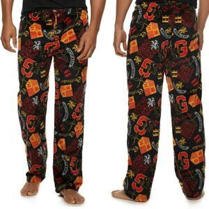 Brand new with tags, officially licensed men's size two-piece sleep set PJs including a graphic tee in black fabric with the Gryffindor house crest from Hogwarts printed on the chest in red and yellow and gray, and a matching pair of lounge pants in fleece fabric with button fly, elastic waist with drawstring, and an allover print of the Gryffindor lion along with shields, Gryffindor banners, crossed broomsticks, crowns, and other designs all in red and yellow and white on a black background.