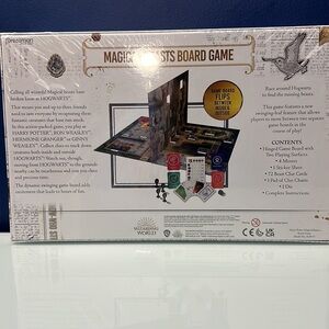 New in its original box and has never been opened! This is a Harry Potter themed board game, challenging its players to race around Hogwarts and find the missing beasts. The board is dynamic and allows players to switch between two different boards!