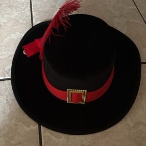 White and black felt fedora – gangster, mobster this hat has a bit of wrinkles see photo. Rainbow, cowboy hat. King royal hat. Iridescent Fish hat, Three Musketeers hat, black, and red with feather. Gold glitter top hat.