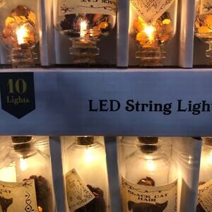 New Haunted Manor light up LED potion bottles string lights with 10 glass bottles that include “black cat hair” and “bone dust”. Lighted length is 4ft 5in and over all length is 5ft 5in. For indoor use only. Requires 2 AA batteries (not included)