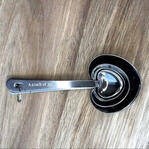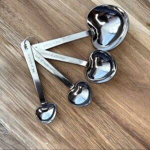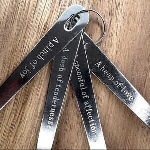 New In Box Heart Shaped Measuring Spoon Set With Cute Sayings Great For Baby Shower Or Wedding Or Other Gift. Multiple sets available & discount for multiple sets. 1 Tablespoon, 1 Teaspoon, 1/2 Teaspoon & 1/4 Teaspoon set of 4. Please see photos for sayings. Please consider bundling for the best deal. Thank you for shopping.