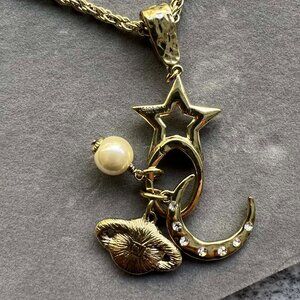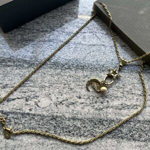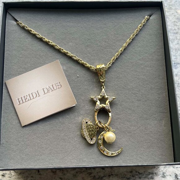 Up for sale is this New Heidi Daus Charm Holder Crystal Star Crescent Moon & Saturn Necklace w/Box.