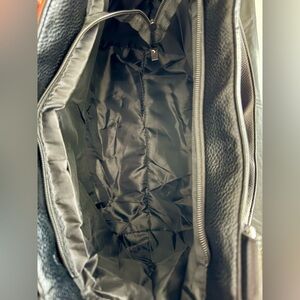 The bag has a zipper closure and an interior zippered pocket. The bag has snaps on each side to cinch it in.