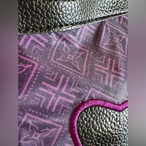 This purse has the Hello Kitty cat embroidered on the front with a cute skull/skeleton theme bow. The bag has a purple diamond pattern and is embellished with silver tone studs. Great for Halloween or any time!