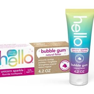 hello Unicorn Sparkle Kids Toothpaste with Fluoride, Bubble Gum Toothpaste, 4.2 toothpaste in a 3 pack. Features bubble gum natural flavor. New sealed boxes