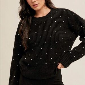 Ribbed black sweater with rhinestones on front and sleeves. By Hem & Thread.