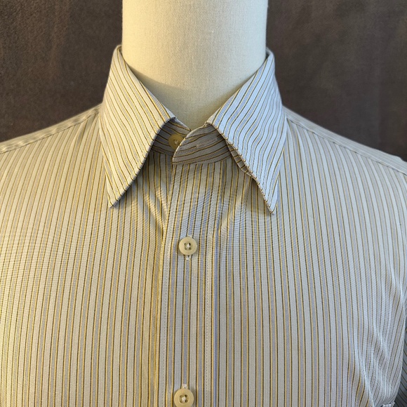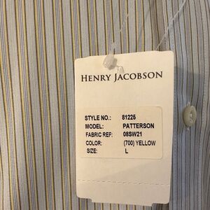 Henry Jacobson putty/ yellow striped 100% cotton, hidden button down collar, woven sport shirt, with barrel cuffs. Original item tag. Original price: $110