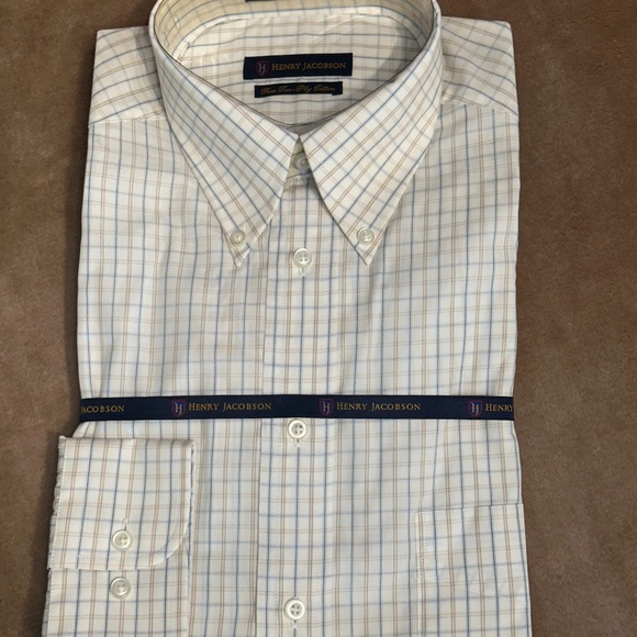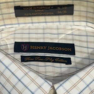New Henry Jacobson 15 1/2” neck, 34/35” sleeve 100s 2-ply 100% cotton cream (&blue/tan) graph check dress shirt with barrel cuffs. Price: $45 with original packaging. Originally priced at $120.