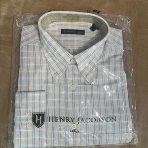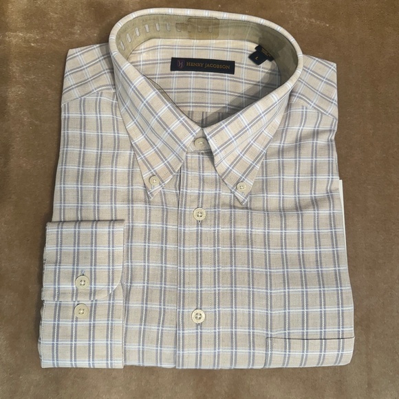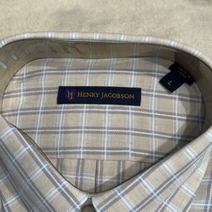 New Henry Jacobson, size Large, 100% cotton taupe plaid woven sport shirt