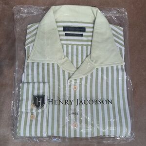 New Henry Jacobson, size Large, 100s- two-ply cotton bright olive/white striped woven sport shirt with one-piece, two-tone collar and barrel cuffs. Price: $45 with original packaging and item tag. Originally priced at $120.