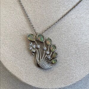 This exquisite necklace features a stunning peacock design with shimmering silver and authentic opal gemstone accents. Adjustable 18-22”. Perfect for adding a touch of elegance to any outfit.