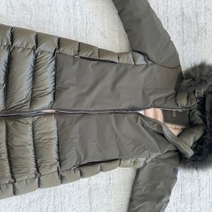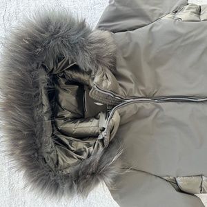 Hetregó Hartley green down jacket combines the softness of boudin quilting with the smoothness of techno stretch. The two fabrics employed create a play of lights and shadows, capable to enhance the silhouette, making this style an easy-chic piece of outerwear perfect for city or for those moments outdoors. A modern design with an innovative construction: this jacket comes with a fixed hood with a removable and precious raccoon trim, that allows the look to be personalised as needed.