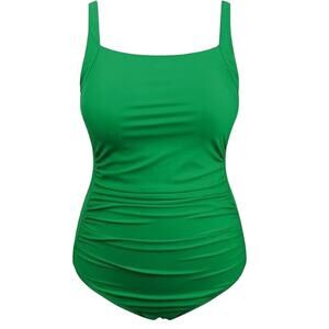 Step into timeless style and confident comfort with this brand new Hilor Women’s One Piece Swimsuit in a beautiful green hue, size 18. Made from a supportive and stretchy blend of 82% Nylon and 18% Spandex, this vintage-inspired swimsuit features a ruched bodice and tummy control design that flatters and smooths your silhouette. The fully lined suit includes a moderate cut leg and modest coverage bikini bottom for a balanced, confident fit.