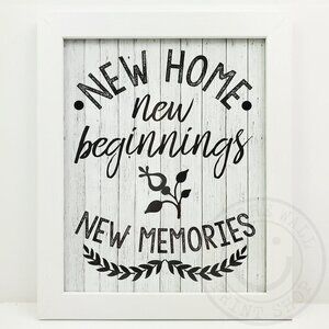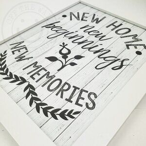 New Home New Beginnings New Memories shabby chic farmouse style white framed art print 100% American and professionally made by me with high quality materials in my U.S.A. workshop. Glass pane, no plastic. The perfect home or business decor addition! When you buy from me, you're supporting a small business :)