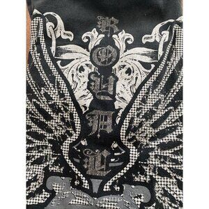 Flying Horse Cyber Y2K Wings Shirt in size 2XL. The shirt features a grunge-inspired design with a black color scheme and glittery letters.