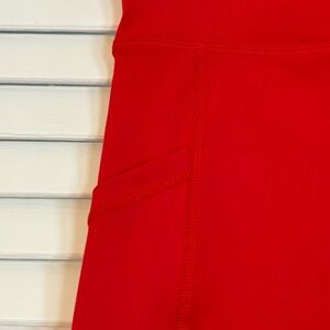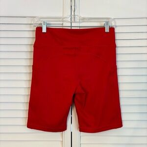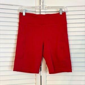 Description: solid red athletic bike shorts with side pockets