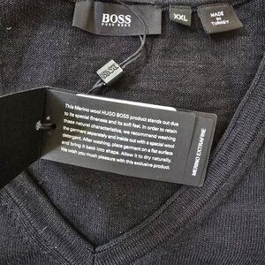 Another incredible find. 3 New Hugo Boss, fine merino wool V-neck sweaters - Black 2XL slim fit, Midnight Blue XL-slim fit and Small - slim fit. The pictures do not do these sweaters justice. The wool is sheer and soft to the touch. The fabric is soft and breathable with structured seam details by BOSS. This elegant basic comes in a slim fit with a V neckline. Feel free to click through and see the sweaters on the Hugo Boss website.