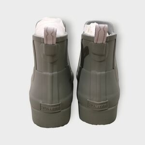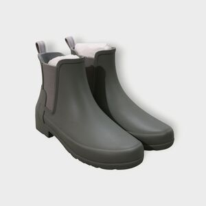 The New Hunter Women’s Docker Gray Rubber Original Chelsea waterproof ankle boots in size 6US are a stylish and practical choice for outdoor occasions in winter, fall, and spring. These solid gray boots feature a round toe, pull-on closure, and a durable rubber outsole with a block heel. The waterproof design and synthetic lining make them ideal for keeping feet dry and comfortable in various weather conditions. The Chelsea style adds a touch of casual sophistication to any outfit, making them a versatile option for everyday wear