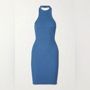 New Hunza G Polly Seersucker Mini Dress Metallic Blue Halter Crinkle Stretchy