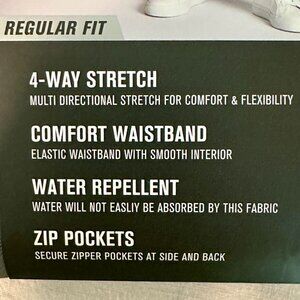 Features ~ 4-Way Stretch, Comfort waistband, Water Repellent, Zip pockets.