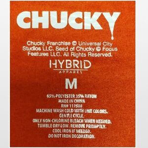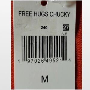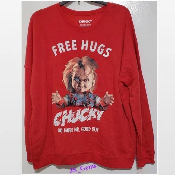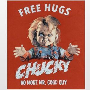 “FREE HUGS CHUCKY NO MORE MR. GOOD GUY” spell out, tagless, & soft stretchy fabric