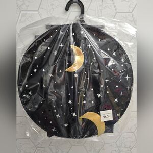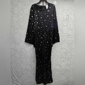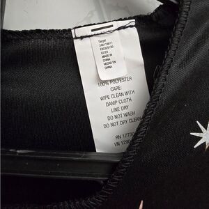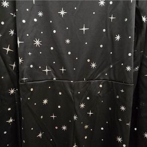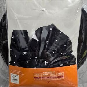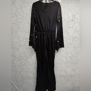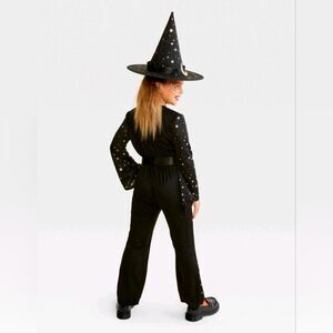 Kids' witch Halloween costume jumpsuit • Made from lightweight fabric • Includes a black jumpsuit with allover white starburst prints, black belt and pointed witch hat with golden crescent moon accent • Lightweight fabric