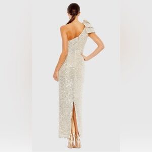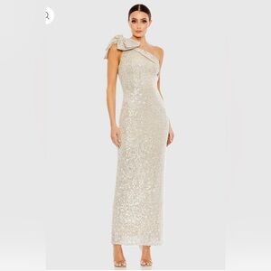 New IEENA MAC DUGGAL Beige Sequined Bow One Shoulder Column Gown Sz: 6 #11283
