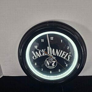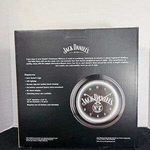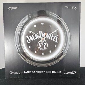 A new in box Jack Daniels LED clock features Old Number 7 graphics surrounded by white LED lights and injected molded black housing. The clock operates on 1 AA battery (I will include). Operated quartz clock movement and neon power adapter included. This has only been out of the box to test and take photos. Works great. See pics. Dimensions 12.5 inches diameter by 2.5 inches deep. Non smoking pet free home. Price Firm. No Bundles.