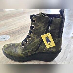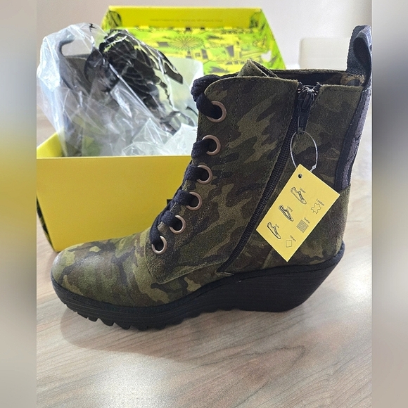 New In Box! Fly London Leather Lace Up Camo Military Green Boots, Size 40/9.5