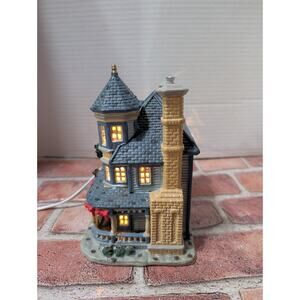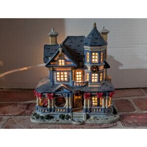 The New In (opened, with flaw) Box Lemax Bensen House Coventry Cove Christmas Village 2004 Lighted Decor is a beautifully crafted ceramic and porcelain Christmas village house from the Lemax Coventry Cove collection. This Victorian-style village piece features hand-painted details, a 3D effect, and comes in its original box packaging. Measuring 7 inches in height and 6 inches in width, this blue-colored house is perfect for holiday and seasonal decor, adding a touch of art, patriotism, and religious themes to any festive display. A delightful addition to any Christmas village collection, this Lemax Bensen House is a charming and timeless piece for adults to enjoy.