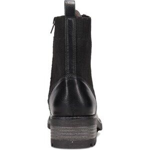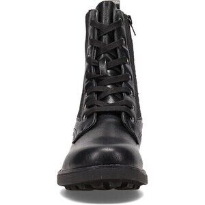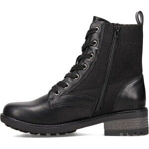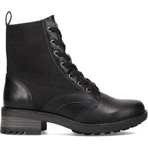 "Stand out from the crowd in this incredibly comfy and stretchy lace-up combat boot. Stretch fly knit upper with microsuede or faux leather accents, round toe, inside nylon zipper, lace-up front, back pull tab, and lug outsole. Toe box and heel counter crafted with recycled materials.