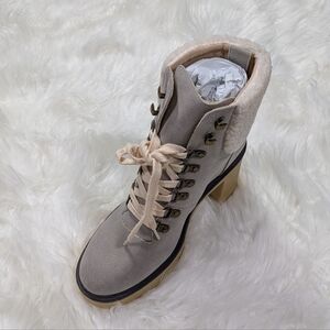 Women, Woman, Women's, Size 7, Boots, Boot, Shoes, Shoe, Heeled, Heels, Heeled Booties, Bootie, Grey, Sherpa, Tan, White, Multicolor, Oasis Society, NWT, New With Tags, New In Box, NIB, Madilyn Boot, Oasis Society California, Fall, Autumn, Autumnal, Winter, Lace Up, Lace-Up, Faux Suede, Suede, Chunky, Block Heel