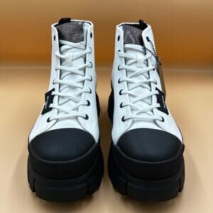 Step out in style with these New In Box Palladium Revolt Hi Tx Women's Boots in a striking Star White and Black colorway, size 7.5. These boots are perfect for adding a touch of urban flair to any outfit. While the box has some damage, the boots themselves are in like new condition. Please note that due to storage, the shoes may have slight dust marks and/or dye transfer. This does not detract from the overall quality and appearance of these awesome boots!