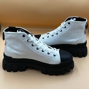 Step out in style with these New In Box Palladium Revolt Hi Tx Women's Boots in a striking Star White and Black colorway, size 7.5. These boots are perfect for adding a touch of urban flair to any outfit. While the box has some damage, the boots themselves are in like new condition. Please note that due to storage, the shoes may have slight dust marks and/or dye transfer. This does not detract from the overall quality and appearance of these awesome boots!