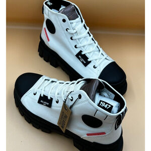 Step out in style with these New In Box Palladium Revolt Hi Tx Women's Boots in a striking Star White and Black colorway, size 7.5. These boots are perfect for adding a touch of urban flair to any outfit. While the box has some damage, the boots themselves are in like new condition. Please note that due to storage, the shoes may have slight dust marks and/or dye transfer. This does not detract from the overall quality and appearance of these awesome boots!