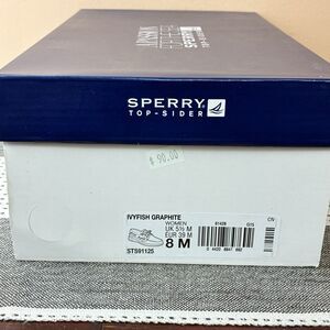 The product is a pair of new in box Sperry Top-Sider Women's Ivyfish Graphite Boat Shoes in size 8M. These slip-on boat shoes feature a flat heel style and standard shoe width, making them ideal for casual wear and beach activities. Constructed with leather upper material and in a stylish gray color, these Sperry shoes offer comfort and durability for everyday use.