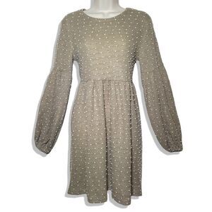 New In - "Mocha Swiss Dot" Long Puff Sleeved Polkadot Textured Scoop Neck Dress;