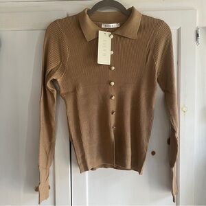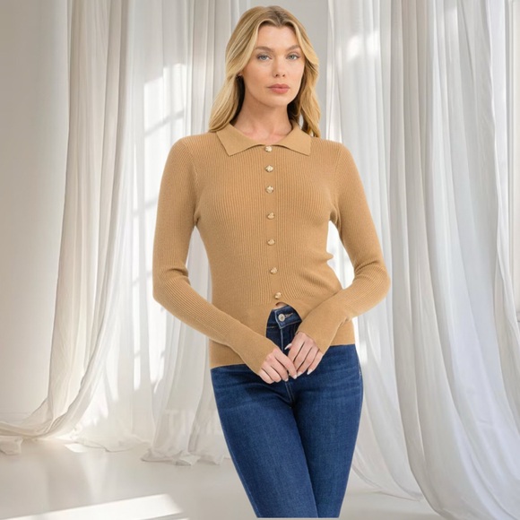 Stretchy ribbed knit top with a flattering fitted silhouette. Soft, comfy, and easy to style for work or casual wear. Faux button front with classic collar.